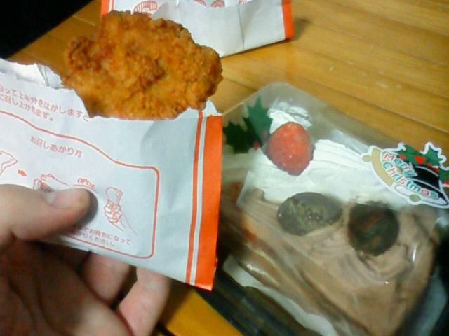 クリスマスらしい事を、進んでやった覚えがないので、今日やってみました。ローソンでフライドチキンとケーキを買ってきました。一番安いものでも、ケーキは少し高めで、2ケ入っておりまして、クリスマスにこの2ケのケーキを自分ひとりで食べる悲しさといったらない。まあ、一日では食べないと思いますが…甘いのはそれほど多く食べれないので。
