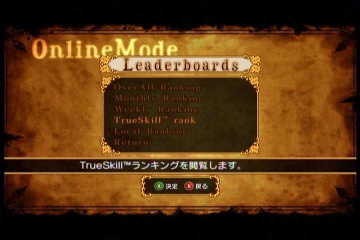 まず、上のスクリーンショットより、オンライン対戦メインメニューの中にXBOX360版中には無くて、PS3版のみあるモードにPrivate Match(プライベートマッチ)という、招待を受けて対戦を開始できるモードがありますね。かたや、下のスクリーンショットより、ランキングを見れるモードなのですが、PS3版にはなく、XBOX360版にはTrueSkill(トゥルースキル)なるランキングが見れるようになってます。このランキングの詳細はよく分かりませんでした…・と、このように、XBOX360版とPS3版のオンラインモードでは多少の違いがあるようです。ちゃんと調べてないのでまだあるかもしれませんね。